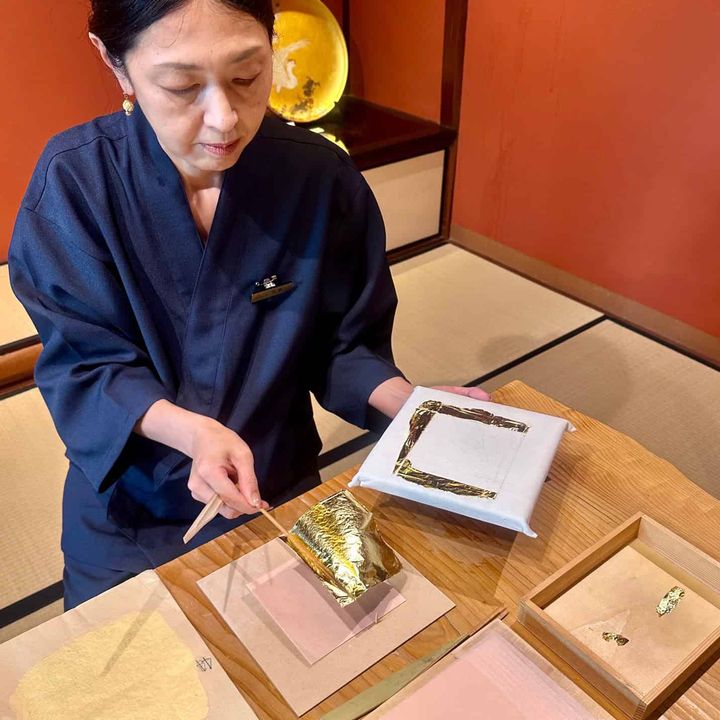 金箔職人が箔を切り揃える「箔移し」の実演。1万分の1ミリという極薄の金箔を自在に操っていきます。