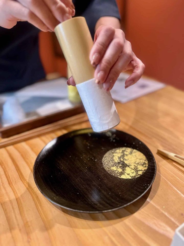 砂子筒といわれる道具で金箔をふるいにかけながら、漆塗りの器に月の模様を描きます。