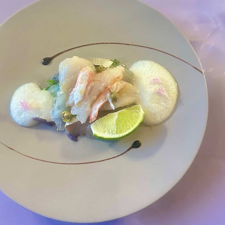 ディナー「シーズナルグリルディナーコース」魚介のマリネ あんがとう農園のサラダ バルサミコクリーム ライムヴィネグレット