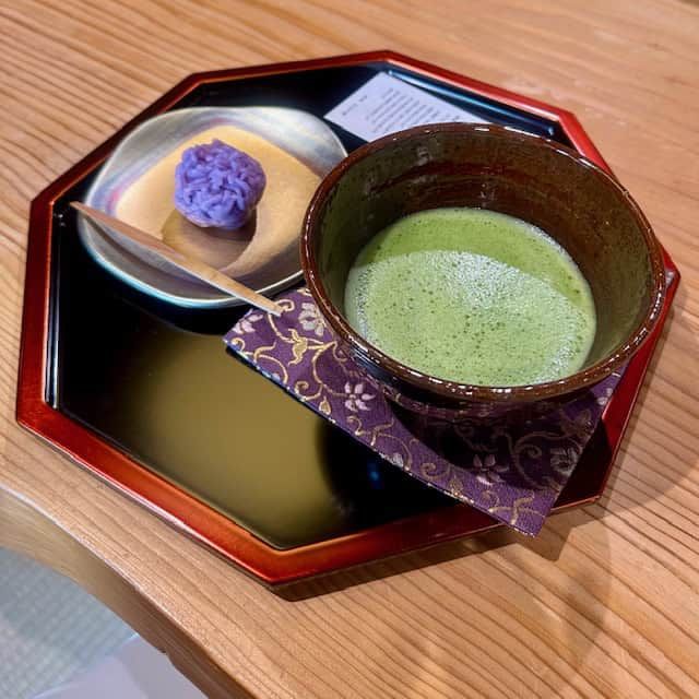 体験後は、350年の伝統ある焼き物「大樋焼(おおひやき)」の茶碗でいただくお抹茶と、金沢の老舗和菓子店「森八」の上生菓子をいただく、至福のひととき♡