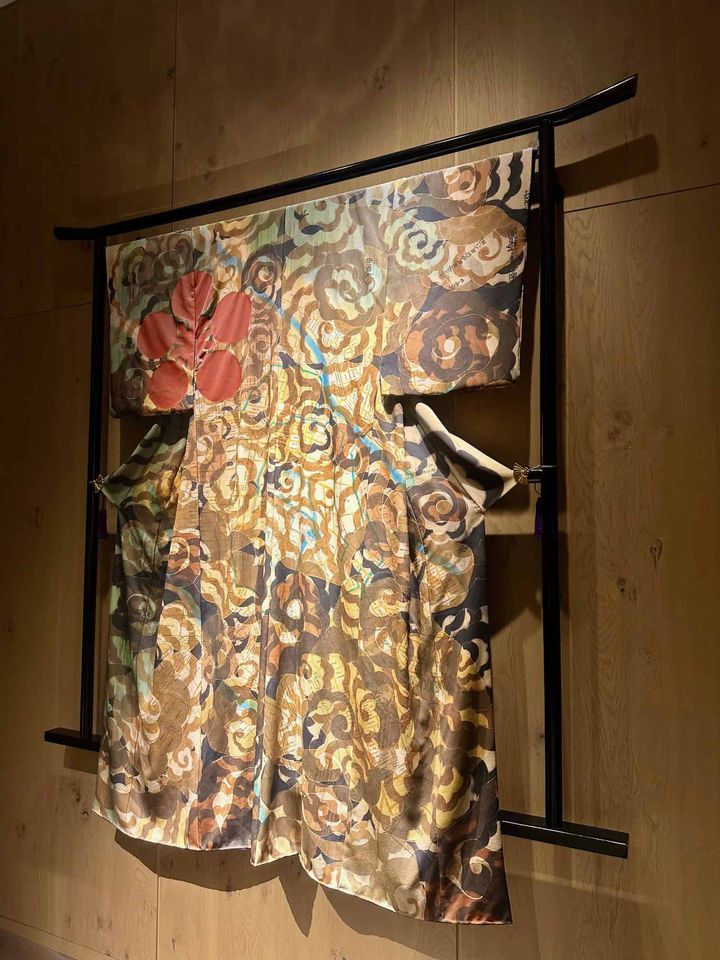 金沢の古地図を下刷りした上に模様を施したオブジェのような着物。