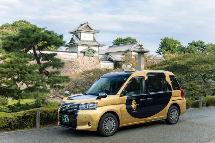 ナンバーが「777」で運気があがる!? と話題の金箔タクシーは、箔一とのコラボレーション。人気があるので予約はお早めに。