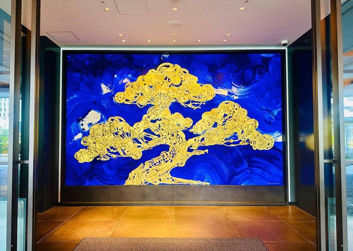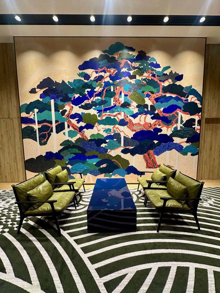 兼六園の唐崎松が描かれた大胆なアート。じゅうたんの波文様とのコントラストが印象的。