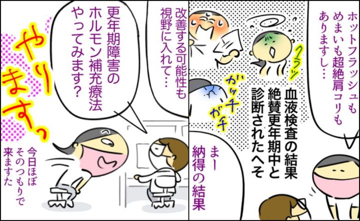 婦人科で女性ホルモン値をチェックするために血液検査をしてもらった結果、へそさんは更年期だと診断されました。更年期のような症状を感じていたへそさんは、ショックを受けるよりも清々しい気持ちになったのだそうです。