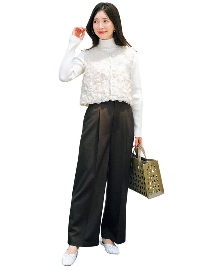 【写真2枚目】ジレは色違い。ニット¥10,780(カデュネ)パンツ¥22,000(アンクレイヴ/アンクレイヴ〈オンワード樫山〉)シューズ¥16,500(ダイアナ/ダイアナ 銀座本店)ピアス¥47,300(ウノアエレシルバーコレクション/ウノアエレ ジャパン)バッグ/スタイリスト私物
