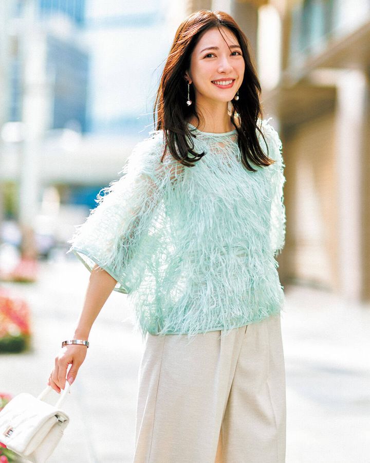 【写真1枚目】ブラウス¥17,900パンツ¥16,900(ともにアモマ)バッグ¥69,300(マエストソ/オブリオ)シューズ¥15,400(ダイアナ/ダイアナ 銀座本店)ピアス¥56,100(ココシュニック/ココシュニック)