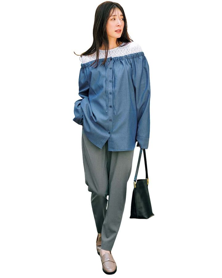 【写真2枚目】ブラウスは着回し。パンツ¥28,600(ハイク/ボウルズ)バッグ¥37,400(オルセット/アンタイトル)シューズ¥23,980(ダイアナ/ダイアナ 銀座本店)カットソー/スタイリスト私物