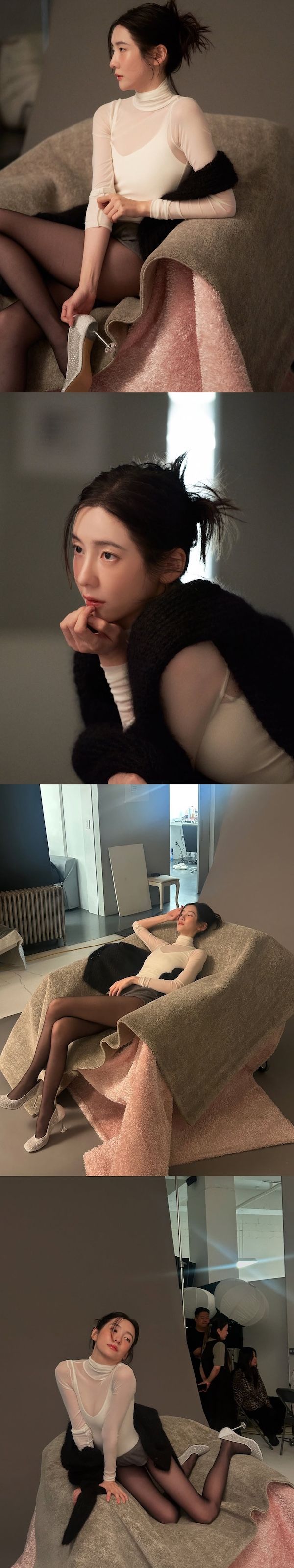 まず目を引くのは、撮影現場での様子。シースルーのトップスにショートパンツ姿の彼女は、ソファに寄りかかったりしながらさまざまなポーズをとっている。