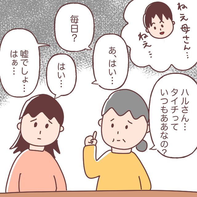 すると、「ハルさん・・タイチっていつもああなの?」呆れたように言う義母に、「あ、はい・・」と答えると、「毎日?」と聞かれ「はい・・」と答えると、「嘘でしょ・・はぁ・・」と呆れるようにため息をつきました。