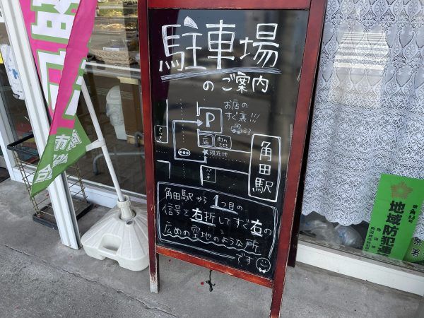 お店の前に駐車場の案内が。駐車場は広いので、ゆっくり買い物が楽しめます。