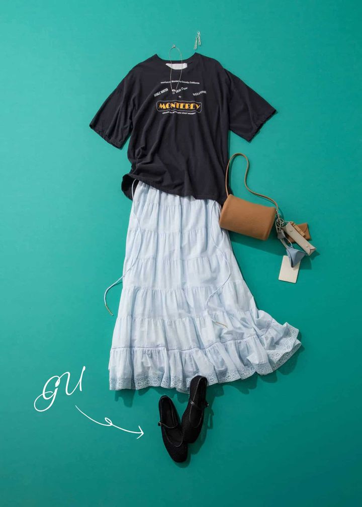 シューズ¥1,990(GU)Tシャツ¥13,200(ティッカ)スカート¥33,000(カーサフライン)バッグ¥33,000チャームセット¥5,500〜※ポップアップ限定販売(ともにヴァジック/ヴァジックジャパン)ピアス¥8,800(YArKA/ロードス)ネックレス¥25,300(ウノアエレシルバーコレクション/ウノアエレ ジャパン)