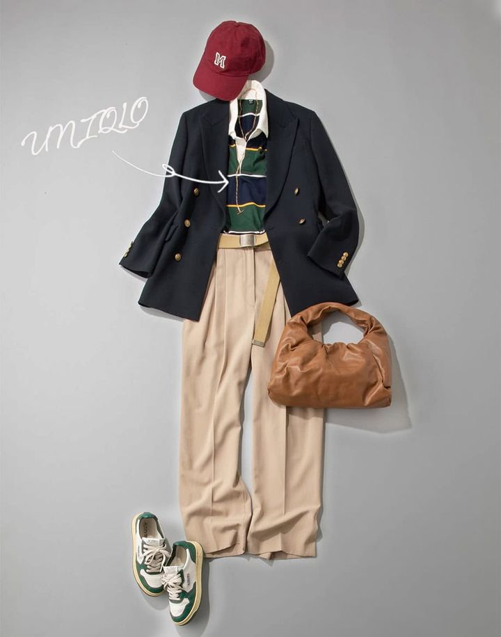 rugby polo shirt/ UNIQLO jacket/ BEAUTY & YOUTH pants/ DES PRES bag/ Bottega Veneta sneakers/ AUTRY belt/ BRILL cap/ L’Appartement necklace/ Pascale Monvoisin すべてスタイリスト私物
