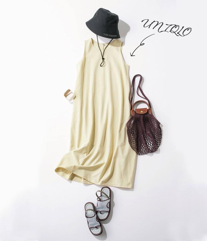 ワンピース¥2,990(ユニクロ)バッグ¥19,800(ロンシャン/ロンシャン・ジャパン)サンダル¥15,400(ル タロン グリーズ/ル タロン グリーズ ルミネ新宿店)ハット¥4,950(THIRD MAGZINE × NEWERA/THIRD MAGAZINE)バングル¥8,640(アビステ)