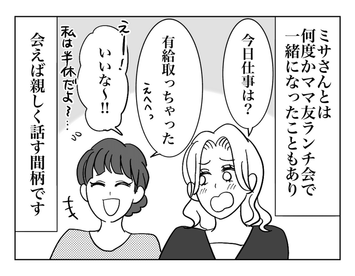 ユキノさんとミサさんは、お互いの子どもが保育園に通っていた頃からのママ友。共に正社員で働いているという共通点があります。さらに今年は小学校のPTA役員を一緒にやることになって……。不安だらけの初めての活動も、昔から知っているママ友が同じなら心強いです! 親しく話せる間柄とのことで、ユキノさんもホッとしたかもしれませんね。