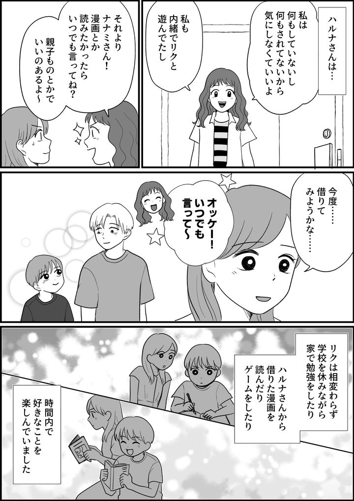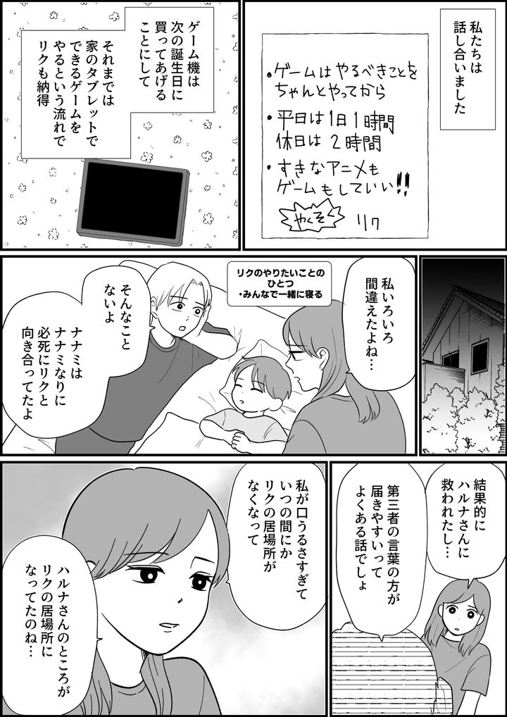 私(ナナミ)は、夫のタツヤと小学校3年生の息子、リクとの3人暮らし。息子をしっかり育てて、立派な大人にしなければと、私はすべてを捧げてきました。しかし最近、リクは不登校に……。そんな中、本人の希望で週3回、リクを義両親宅へ預けることになりました。しかしリクは義妹のハルナさんの家に行き、私がダメだと言い続けていたゲームで遊んでいたのです! 私はもう何もかもが信じられず、疲れ切ってしまったのでした。すると夫から「週末はリクのやりたいことをしよう」と提案され、家族でアニメを観ることに。しかしリクはアニメを観ながら私の表情ばかりを気にしていました。この子は自分の感情よりも母親の感情を最優先に考えるようになってしまっている……。そう気付いた私がリクに「言いたいことある?」と聞くと、学校に行けなくなった理由のほかに、家でのルールを話し合いたいと言われたのでした。