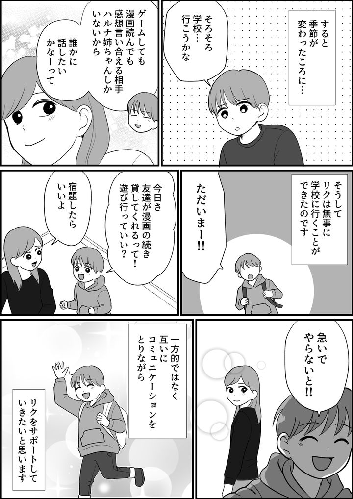 リクの言葉に耳を傾け、こちらの要望とすり合わせて納得する着地点を探す試みをしてから、家庭内は驚くほど穏やかになり、リクの足も学校に向かうようになってくれたのです。