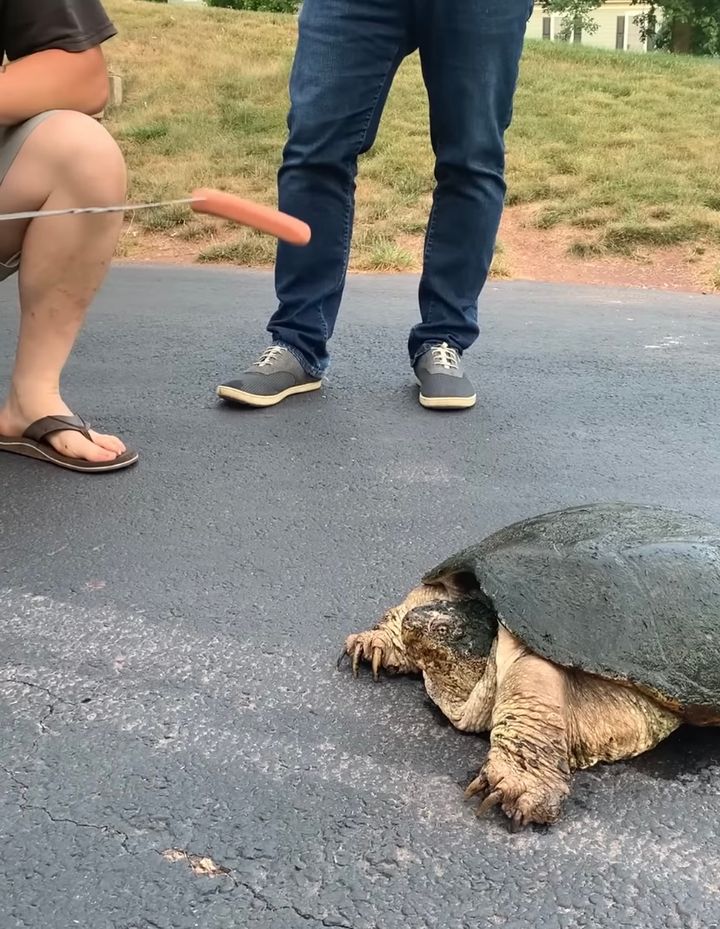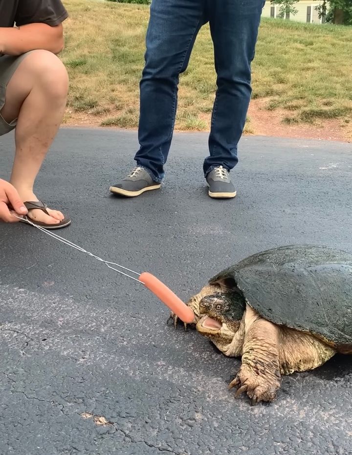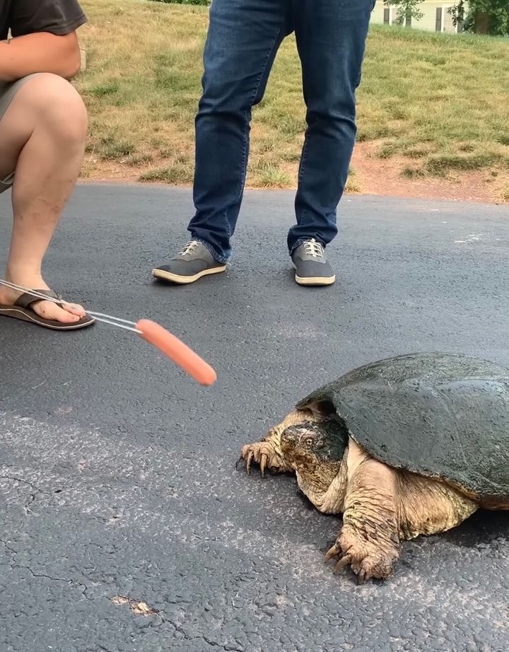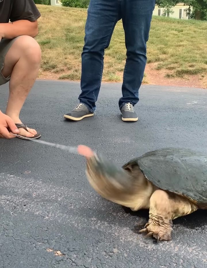 合法的な手段で捕獲されたというこのカミツキガメが飢えないように、男性がエサのソーセージを差し出します。 すると直後に、衝撃的な光景が目撃されるのです。