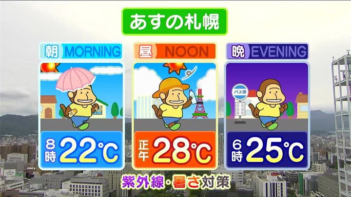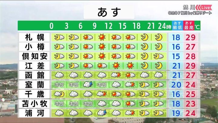札幌周辺は晴れて、紫外線と暑さ対策が必要です。函館は雲が広がりやすく、室蘭や苫小牧、浦河では霧雨や小雨の降る時間もありそうです。