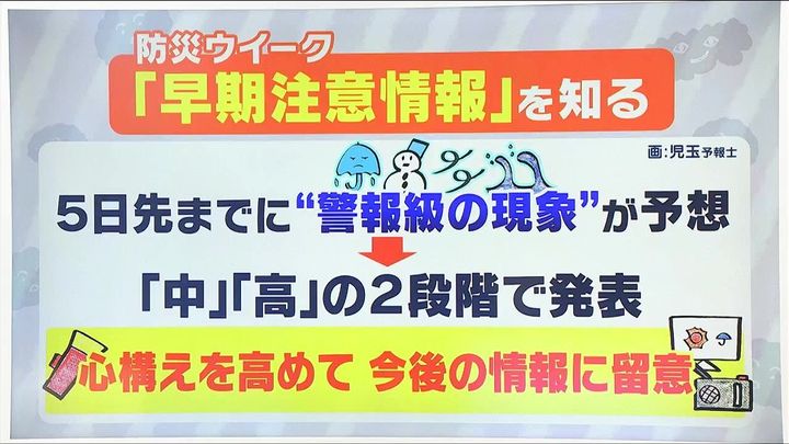 ということで、早期注意情報を紹介します。警報が出ると生活への影響も大きいため、5日先までに雨や雪、風、波による警報級の現象が予想された場合、警報級の可能性を「中」「高」の2段階で発表します。