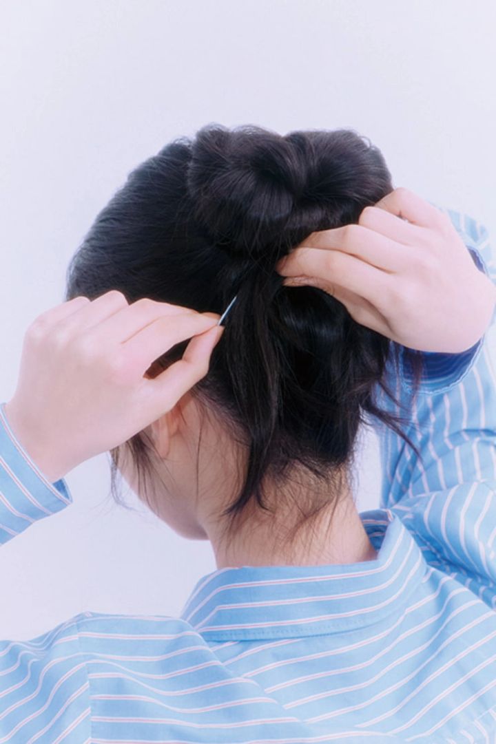 10㎝ほど毛先を残して最後はアメピンでとめる。おだんごに動きが出て、オトナなニュアンスに。もう一方の毛束も同様に行う。