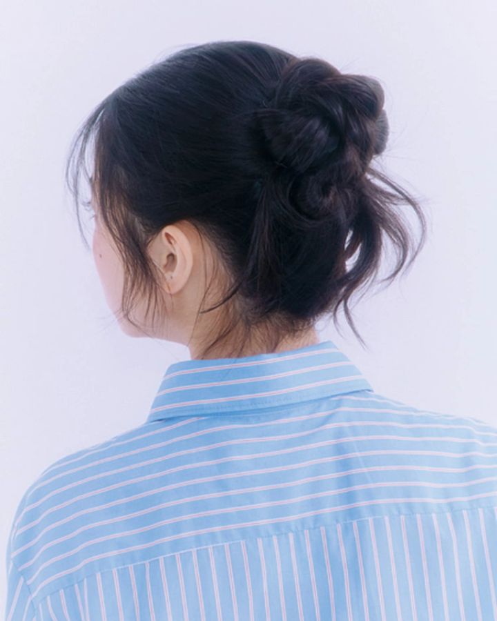 トレンドのオフィスコアなムードを増すまとめ髪は、ねじってひとクセつけたおだんごで、おんなみ◎。ブラウスともマッチするヘアアレンジだから、デイリーでも取り入れて!