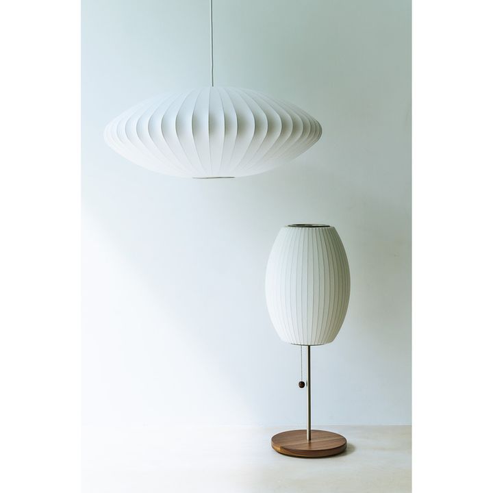 シルク製ランプから着想を得た、樹脂シェードの照明。クラシカルな形は長く愛せる名作。[右から]ネルソン シガー ロータス テーブル ウォルナット〈H67×W26.5cm〉¥161,700、ネルソン ソーサー バブル ペンダント ミディアム〈H25.5×W63.5cm〉¥121,000(ともにハーマンミラー/ロイヤルファニチャーコレクション)