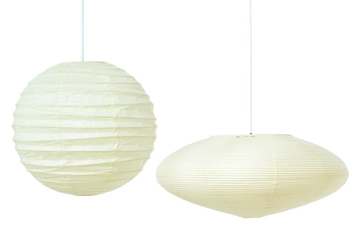 世界的人気を誇るイサム・ノグチ「AKARI」。和紙と竹ひごを使った軽量で繊細な構造はまるで工芸品のよう。ふんわりと照らす丸い灯りは和洋問わず溶け込みます。[右から]ペンダントシェード21A〈H29×W66cm〉¥30,800、45D〈H44×W45cm〉¥18,700※コード、電球は別売り(ともにAKARI/オゼキ)
