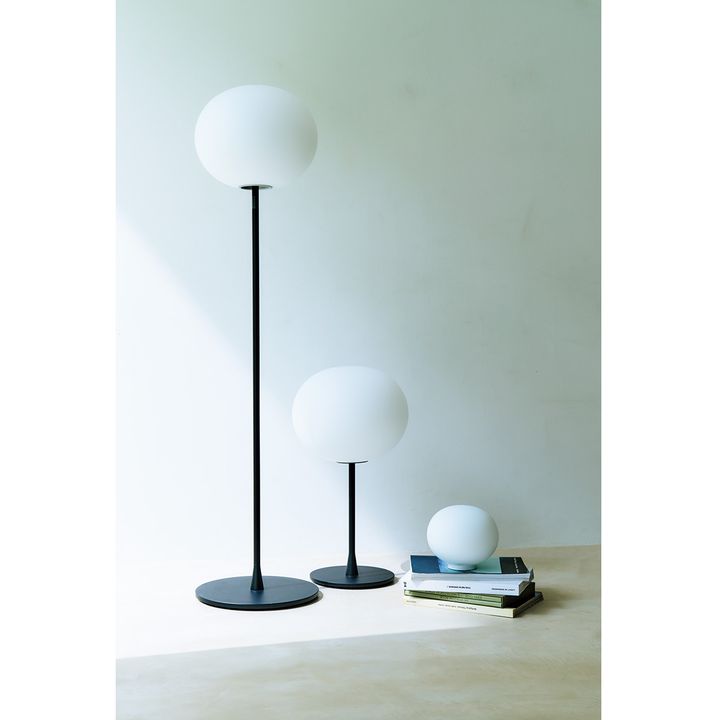 イタリアの照明ブランド・フロスの名作。ミニマルな形と乳白色のガラスから漏れるマットな光は、心安らぐ空間に一役。[右から]GLO-BALL BASIC ZERO〈H16×W19cm〉¥63,800、GLO-BALL T1〈H60×W33cm〉¥134,200、GLO-BALL F1〈H135×W33cm〉¥176,000(すべてFLOS/ACTUS)