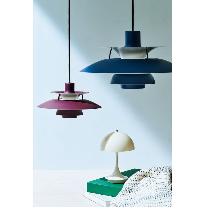 PHランプシリーズは眩しさのない心地よい光を放つよう設計されたシェードの機能美が魅力。愛らしい半球形が人気のパンテラはアクリルシェードから優しい光が広がります。[右上から反時計回り]PH5〈H26.7×W50×D50cm〉¥161,700、PH 5ミニ〈H16.3×W30×D30cm〉¥117,700、パンテラ160ポータブル〈H24.1×W16×D16cm〉¥39,600(すべてLouis Poulsen/ルイスポールセンストア東京|大阪)ブランケット¥9,900(ACTUS)