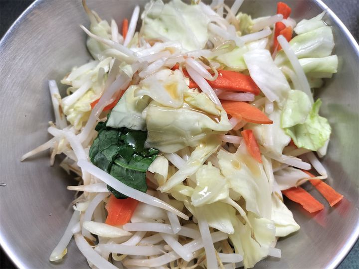 3. 市販のカット野菜と和えるだけ!二郎系の山盛り野菜をレンジで再現!『ラーメンの上だけ!!!』で“上”作ろう