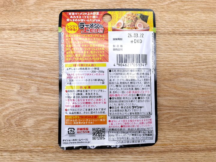 この商品を発売したのはダイショーという会社で、他にも調味料に力を入れた商品を展開しています。この「ラーメンの上だけ!!!」は小さめのパックで売っていますがいつものごとくスーパーを回っても見つからず、ダイショーさんに直接問い合わせて扱っている店舗を教えていただき、ようやく買うことができました。