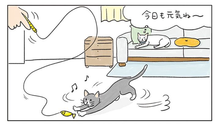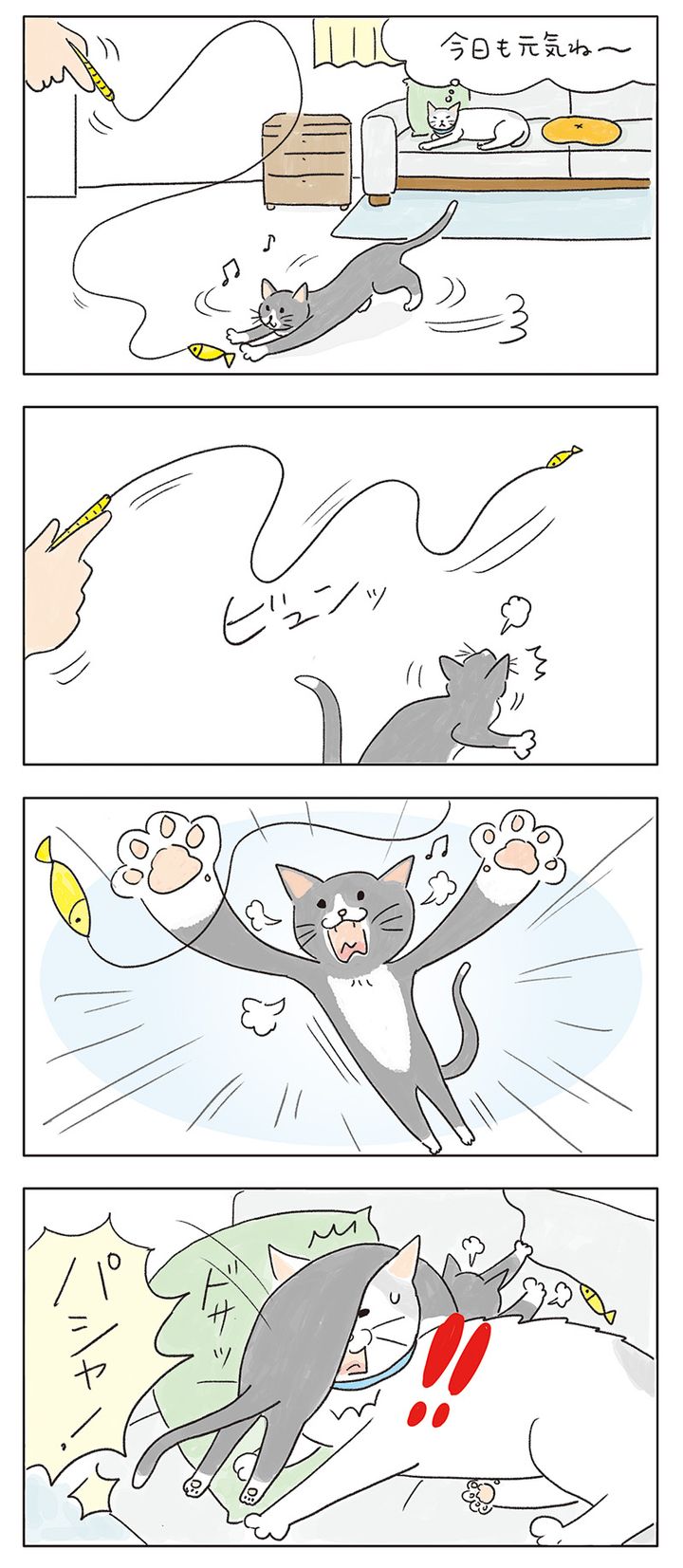もう一匹の家ねこと飼い主の遊ぶ様子を呑気に眺めていたら・・・。