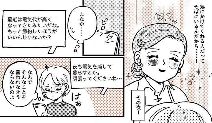 オーナーと話したその夜、タクミからLINEがきていました。「もっと電気代を節約しろ」という内容でした。自分がヒマだからって、わざわざネットで電気代まで確認して、電気代が高い? 節約しろ? ふざけんじゃない。自分は贅沢三昧のくせに……いい加減にしてよ! もう悲しむだけの私でも、言われっぱなしの私でもありません。今の私には自信があります。