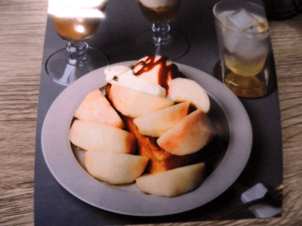 フレンチトーストに桃が添えられた「季節の果実フレンチトースト(2,000円)」(+200円で自家製アイストッピング)もあります。 ※フレンチトーストの写真は、お店側からお借りした写真を撮影させて頂きました。