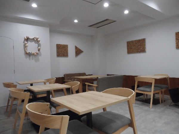 テーブル席も、木目の色が暖かみを感じます。 壁に、四角と三角の板(?)が飾られています。ちょっと不思議で面白いと思ったら、これは後日知ったのですが、店名の「SHIKAKU TO MIKAKU」つながりで、「四角(しかく)と三角(みかく)」とかけているのだそう。