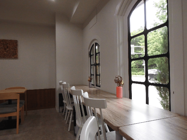 店内に足を踏み入れると、スタッフの女性の明るい笑顔の出迎えがあり、ちょっと緊張気味だったのが一気にほぐれました。 白と木目を基調とした内装は、とても明るく洗練されたインテリアで素敵です。私は窓からの眺めが良いカウンター席を選びました。