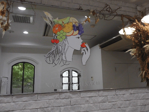 看板には「フルーツパーラー SHIKAKU TO MIKAKU」とあります。 頭の上にいろいろなフルーツを山盛りにしている女性が、苺をつまんでいるロゴがユニークです。