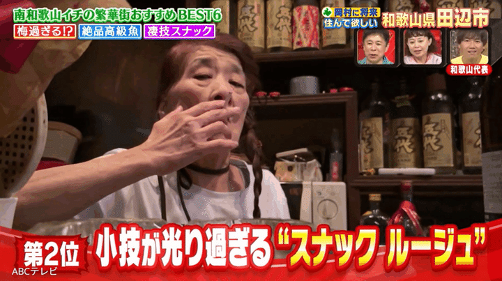 なおスナックルージュは、『なるみ・岡村の過ぎるTV』(ABCテレビ)9月1日放送回で紹介された。同放送回では、人気企画「岡村に住んで欲し過ぎる街」シリーズ初となる和歌山県にフィーチャー! 関西一の巨大都市・田辺市のカルチャーやグルメ、絶景など、知られざる魅力が特集され、スナックルージュは「田辺っ子オススメ!岡村に通って欲し過ぎるお店ベスト6」の第2位にランクインした。