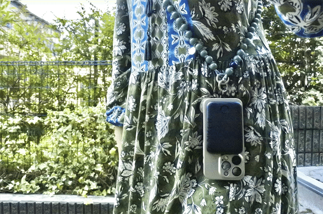 強力マグネットでスマホにピタッとくっつき、簡単に外れません。筆者の場合、持ち運んでいる間に、外れて落下したことはないので安心感があります。やや重さはありますが、モバイルバッテリーを装着したままスマホショルダーにぶら下げても落ちることはありません。