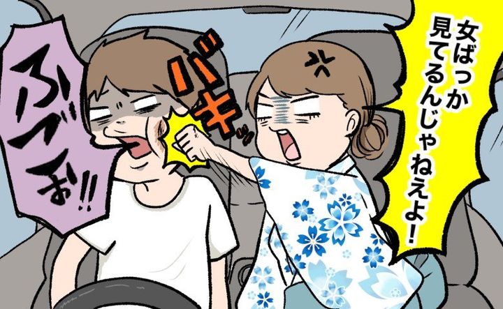 花火大会会場近くの駐車場に車を停めた僕。彼女が「飲み物を買ってくる」と外に出たので、戻ってくるまで車の中で待っていることにしました。周囲はお祭りの雰囲気で、僕はその楽しげな様子を車の中から眺めていたのですが……。飲み物を買って戻ってきた彼女は大激怒。そしてなんと僕の左頬にグーパンチ!