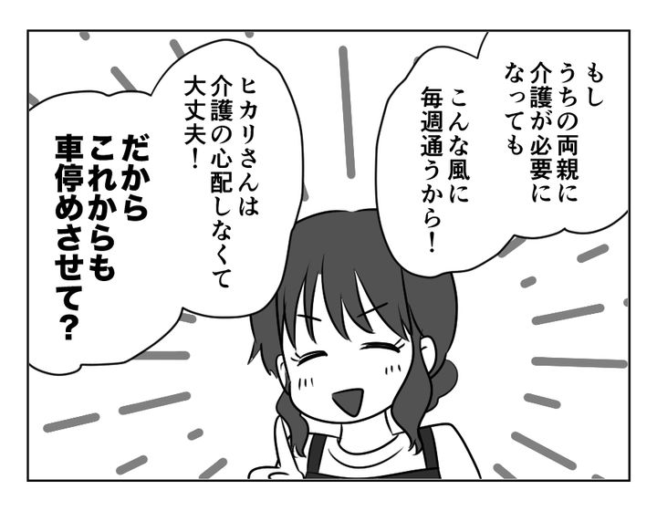 ヒカリさんは、自宅の敷地内に毎週、義妹エマさんが車を停めるので困っていました。「もう停めないで」と言ったにもかかわらず、またやってきたエマさん。帰ってもらおうと話しに行くと、「将来、私が両親の介護をするから、車を停めさせて」と、なんともピントのズレたことを言われてしまいました。