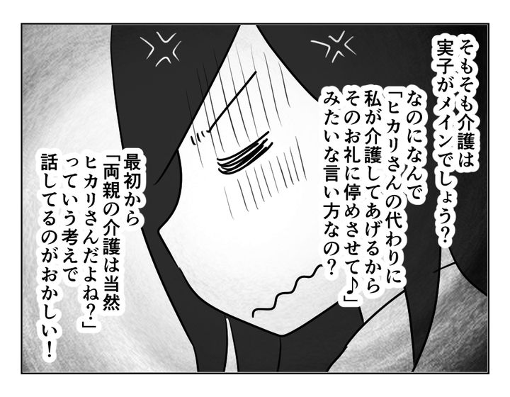 そもそも義両親が、わざわざ車を使う距離に住むエマさんより、歩いて数分のカズトシさんたちを頼るのは目に見えています。カズトシさんも、そのつもりでこの場所に家を買ったのでしょう。そしてここに家を買った時点で、ヒカリさんも義両親の老後をサポートはある程度覚悟していました。でも、あくまでもサポート。介護はやはり、実子がメインというのがヒカリさんの考え。「いいこと言ったでしょ」とドヤ顔をするエマさんに、ヒカリさんのモヤモヤは増すばかりです。