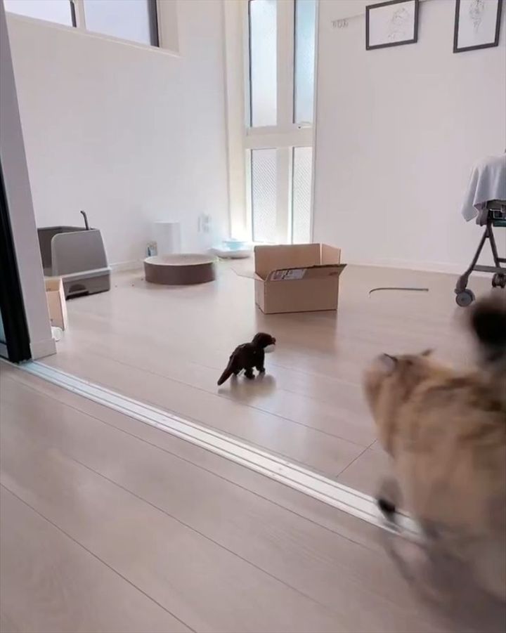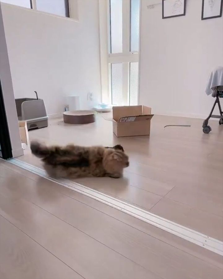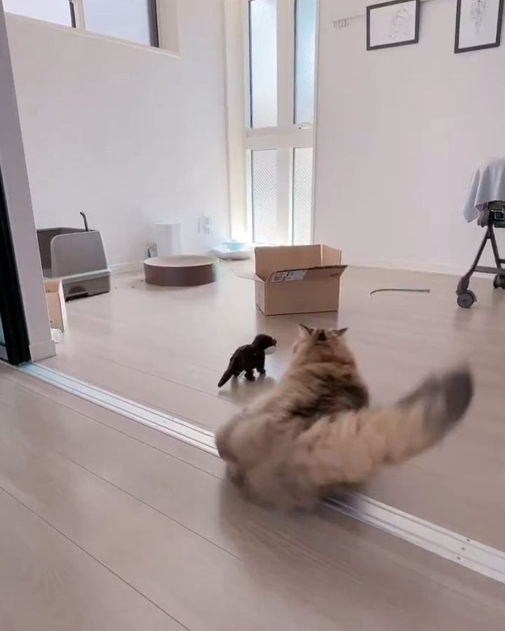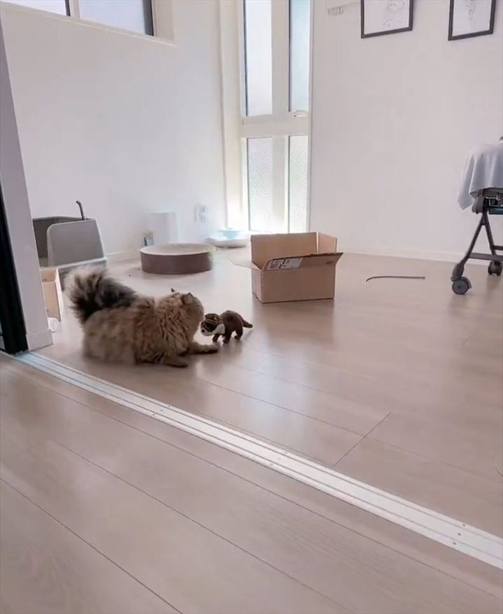 ぬいぐるみの前までやって来たサイベリアン。 なんと、この子はとんどもなくカッコいい登場をしてみせたのです!