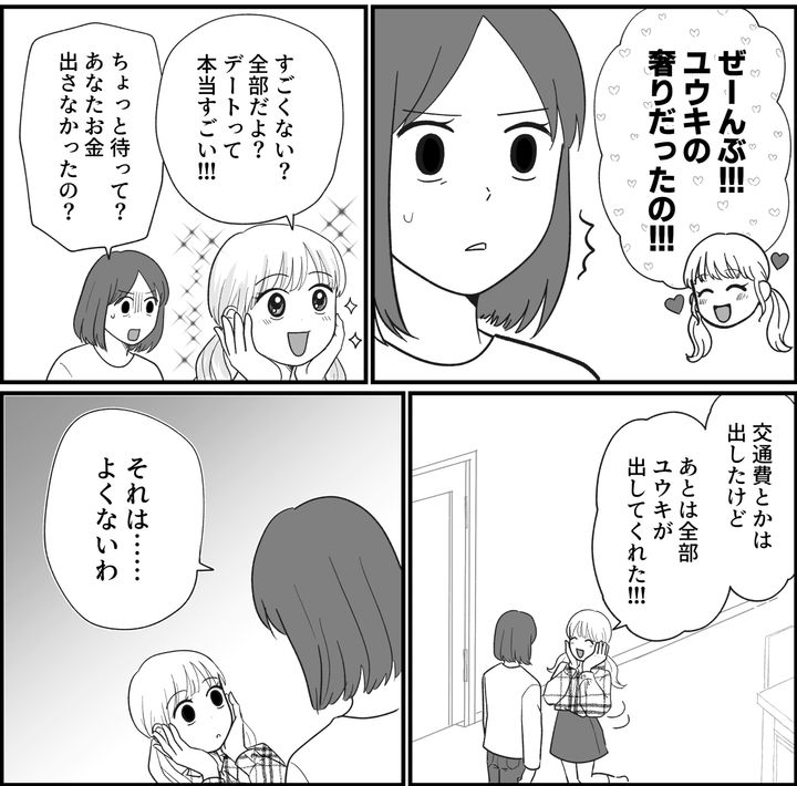 初デートが相当楽しかった様子のヒマリは、興奮を抑えきれないように前のめりに話してきます。しかし……デート代がユウキくんの奢りだったと聞いて、私は驚いてしまったのです。しかも、ヒマリが奢ってもらったことをあまりに喜んでいるので、思わず苦言を呈してしまいました。