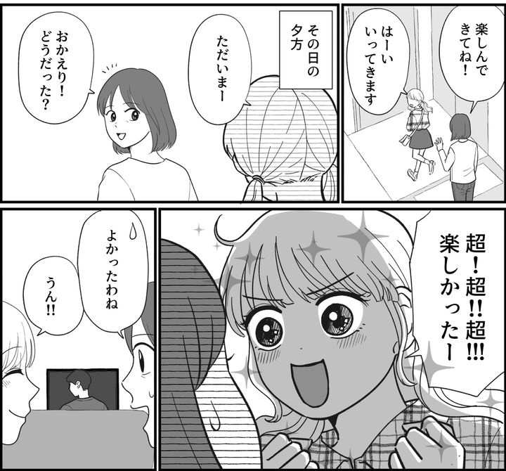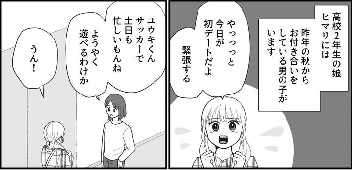 私(シズカ)は、夫と娘のヒマリ(高校2年生)との3人家族です。ヒマリには昨年秋からお付き合いしている男の子がいます。彼の名前はユウキくん。サッカー部に所属しており、練習や試合で忙しくてなかなかゆっくり会えないとヒマリがぼやいていました。若いうちの恋愛は何事も経験です。いろいろな気持ちを経験しながら大人になっていってほしいな……そんな風に思っていました。そんなある日、ようやく初デートをしてきたヒマリが上機嫌で帰宅してきて……?