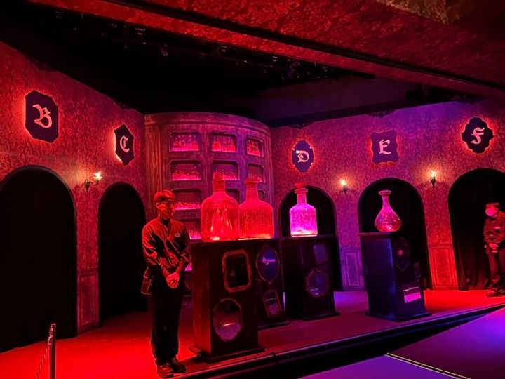 “感情の試練”を課されたゲストは、喜怒哀楽の感情が詰まった大きな瓶が並ぶ大広間へ案内されます。AからFまで用意された個室に入ると、いよいよ“感情の診断”が始まります。魔女たちの指示に従いながら、鏡に向かって感情あふれる表情を見せ、喜怒哀楽、4つの感情を診断しました。最初は少し緊張しましたが、最後の「楽」の表情では、思いっきり自分を解放できた気がします!