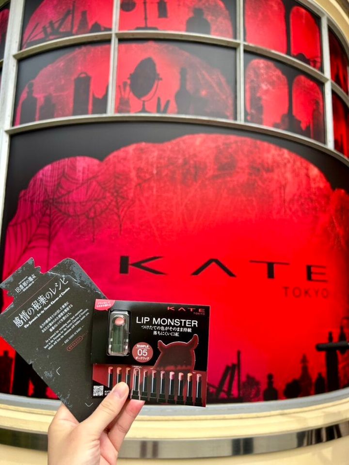 タッチアップの体験を終えると、出口では「ケイト」の“落ちにくい口紅”でお馴染みの「リップモンスター」のテスターがもらえました。リップモンスターオタクの私にとっては、とても嬉しいサプライズ!いろいろなカラーが用意されていますが、ランダムで選んでみたら“ダークフィグ”でした♡