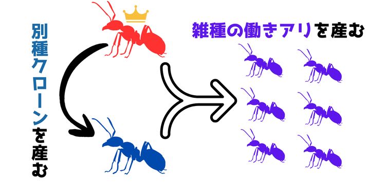 こうして産まれた“クローンオス”は、さらに女王アリと交尾し、雑種の働きアリを作るための「精子供給源」として使われます。