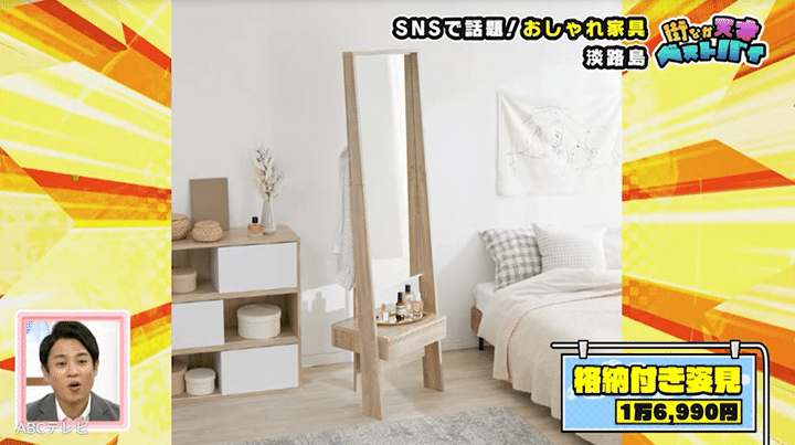 そこで天才ピアニストは、大阪在住の彼氏と約1ヵ月ぶりのデート中だった女性に突撃インタビュー! 普段東京で暮らしている女性は、SNSで人気の家具雑貨オンラインストア・LOWYA(ロウヤ)の格納付き姿見がベストバイとのこと。彼女はこれをドレッサーとして活用しており、「なくてはならないベストバイ」だそうです。