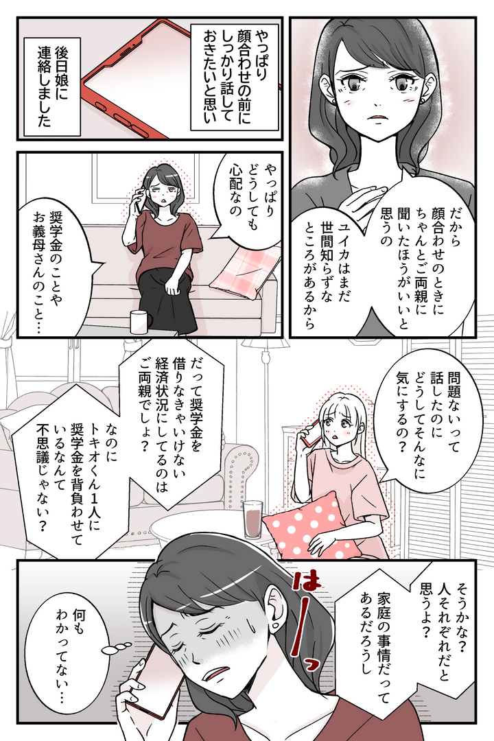 奨学金のことや、義母が働いていないことに違和感を覚えた私は、将来娘が義両親との付き合いで苦労するのではないかと思ってしまいます。私はその心配を娘に伝えましたが、娘は「人それぞれ」と深く考えていないようです。